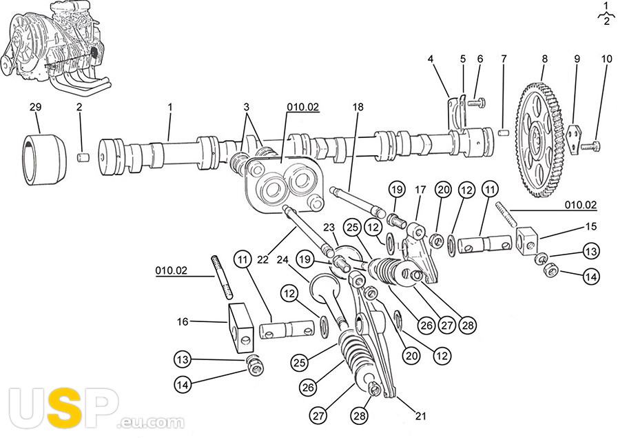 Številka 22 na sliki.Pogonska palica je ključni del motorja, ki prenaša gibanje iz ventilnega brega na ventil. Uporablja se za odpiranje in zapiranje ventilov, kar omogoča dovajanje zraka in izpuščanje izpušnih plinov. Izdelana je iz trpežnih materialov, kot je krom-molibden, za zagotavljanje trdnosti in vzdržljivosti.