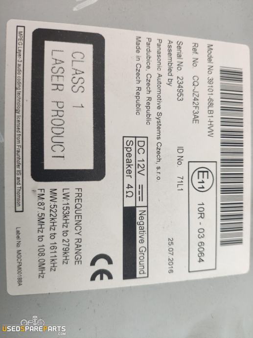 Radijski CD predvajalnik za Suzuki Swift (ZA/ZC/ZD) iz leta 2010. Delovni številka: CQJZ42F3AE. Proizvajalec: Panasonic. Ta del je prvotni izdelki znamke in je primeren za vozila Suzuki Swift z bencinskim motorjem 1.2 16V. Vključuje funkcije predvajanja CD-jev in radijskega sprejema.Znamka: Suzuki