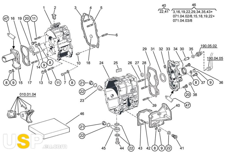 Številka 46 na sliki.Set tesnil je del za tesnjenje in popravljanje delov avtomobila. Uporablja se za zagotavljanje tesnosti in preprečevanje izgube tekočin ali zraka. Lahko se uporablja pri popravilih motorja, menjalnika ali drugih delov, kjer je potrebna tesnost.