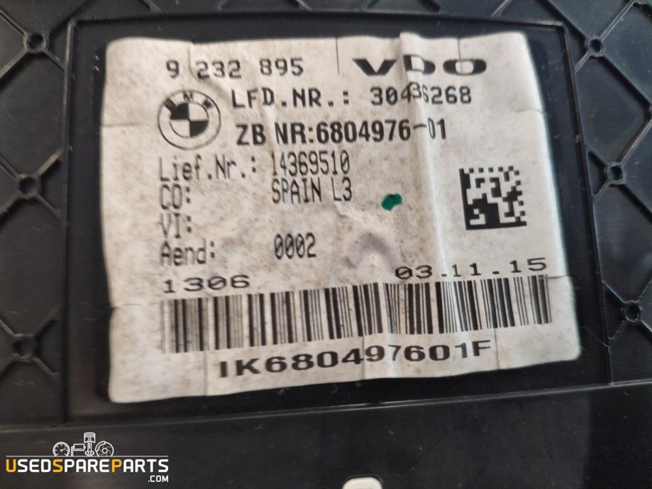 Instrumentna plošča za BMW 3 serijo (F30) in 4 serijo (F32) iz let 2012-2016. Delovna številka: 9232895. Ta del je originalni BMW del (OEM) in vključuje vse potrebne funkcije za prikazovanje podatkov o vozilu, kot so hitrost, obrati, temperatura motorja in drugi pomembni podatki.