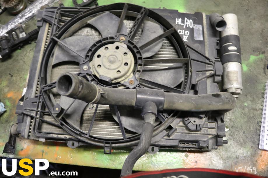 Ventilator in hladilniki za klimo in vodo so deli, ki zagotavljajo hlajenje in klimatizacijo v vozilu. Ventilator zagotavlja pretok zraka skozi hladilnike, medtem ko hladilniki hladijo vodo in freon za klimatsko napravo. Ti deli so bistveni za komfort in varnost vožnje, saj preprečujejo pregrevanje motorja in zagotavljajo prijetno okolje v kabini.Znamka: Renault
