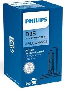 Xenon žarnica D3S Philips WhiteVision 5000K - PH42403WHV2C1. Lastnosti: napetost 42V, nazivna moč 35W, Pk32d-5. Žarnica zagotavlja boljšo vidljivost na cesti, saj v primerjavi z ostalimi ksenonskimi žarnicami proizvede za 120% več svetlobe. Barvna temperatura s 5000K osvetljuje tudi najmanjše podrobnosti.