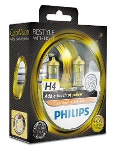 Žarnica Philips H4 ColorVision Yellow - PH12342CVPYS2. Lastnosti: napetost: 12V, nazivna moč 55-60W, P43t-38. Žarnice proizvedejo do 60% več svetlobe. Rumena barva.