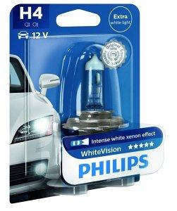 Žarnica Philips H4 WhiteVision - PH12342WHVB1. Lastnosti: napetost: 12V, nazivna moč 55W, P43t-38. Žarnice proizvedejo do 60% več svetlobe.