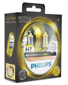 Žarnica Philips H7 ColorVision Yellow - PH12972CVPYS2 (2 kosa). Lastnosti: napetost 12V, nazivna moč 55W, PX26D. Žarnice proizvedejo do 60% več svetlobe. Rumen učinek.