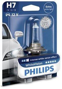 Žarnica Philips H7 WhiteVision - PH12972WHVB1. Lastnosti: napetost 12V, nazivna moč 55W, PX26D. Žarnica proizvede do 60% več svetlobe. Maksimalen Xenon učinek.