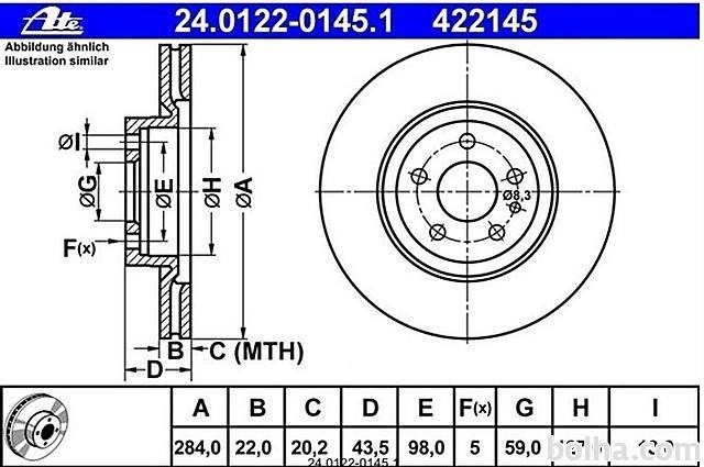 ZAVORNI DISK A-147,156,164,THEMA PREDOpis: Premer [mm]: 284; Debelina zavorne plosce (diska) [mm]: 22; Najmanjsa debelina [mm]: 20,2; Vrsta ploscnih (kolutnih )zavor: prezracevan; Stevilo lukenj: 5; Povrsina: prevlecen (premaz); Premer krozne luknje -? [mm]: 98; Visina [mm]: 43,5; Premer centriranja [mm]: 59; Notranji premer [mm]: 127; Vrtina, premer valja-? [mm]: 13; MAPP-Code na razpolago:OE #:...Več podatkov si oglejte na tej povezavi...