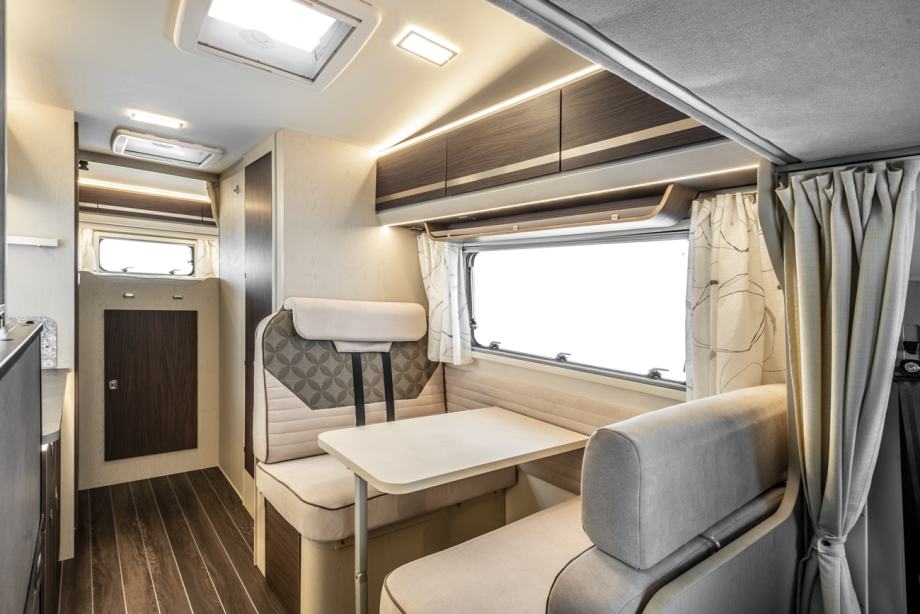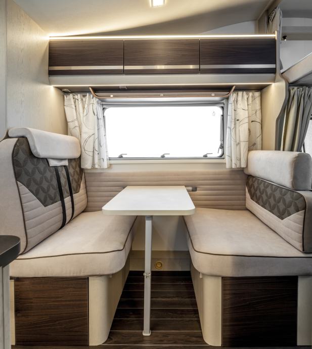Avtodom SEAL 5 z izjemno prilagodljivim notranjim prostorom. V zadnjem delu avtodoma je udobno ležišče za dve osebe, medtem ko v mansardi najdete ležišče za dodatni dve osebi. Notranjost avtodoma je opremljena s sodobno kuhinjo in jedilno garnituro, ki jo sestavljata sedežna klop (ki se lahko raztegne v dodatno ležišče za dve osebi) in dva vrtljiva kabinska sedeža. Kuhinja je praktično zasnovana, opremljena pa je tudi s 145l hladilnikom z zamrzovalnikom ter plinskim kuhalnikom s tremi gorilci. Vse okenske površine so opremljene s senčniki in komarniki.