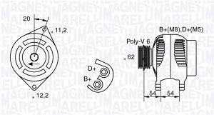 Alternator Alfa Romeo, Fiat, Lancia. Lastnosti: Napetost 12 V. Alternator-polnilni tok 100 A. Premer jermenice 62 mm. Vrtenje v smeri urinega kazalca. Z jermenico za rebrasti jermen.