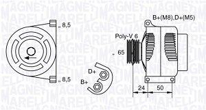 Alternator Fiat, Lancia. Lastnosti: Napetost 12 V. Alternator-polnilni tok 70 A. Premer jermenice 65 mm. Vrtenje v smeri urinega kazalca. Z jermenico za rebrasti jermen.