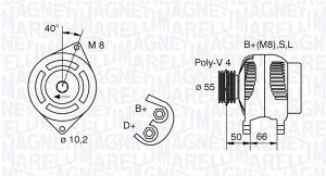 Alternator Fiat, Lancia. Lastnosti: Napetost 12 V. Alternator-polnilni tok 75 A. Premer jermenice 55 mm. Vrtenje v smeri urinega kazalca. Z jermenico za rebrasti jermen.