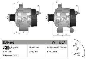 Alternator Opel, Saab. Lastnosti: Napetost 14 V. Alternator-polnilni tok 130 A. Število reber 6. Premer jermenice 62 mm. Z jermenico za prosti tek. Za vozila s 12V omrežjem.