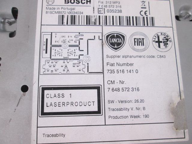 RADIO CD / OJACEVALNIK / IMETNIK HIFI OEM N. 7355161410 ORIGINAL REZERVNI DEL FIAT 500 CINQUECENTO 312 MK3 (2007 - 2015) DIESEL LETNIK 2007