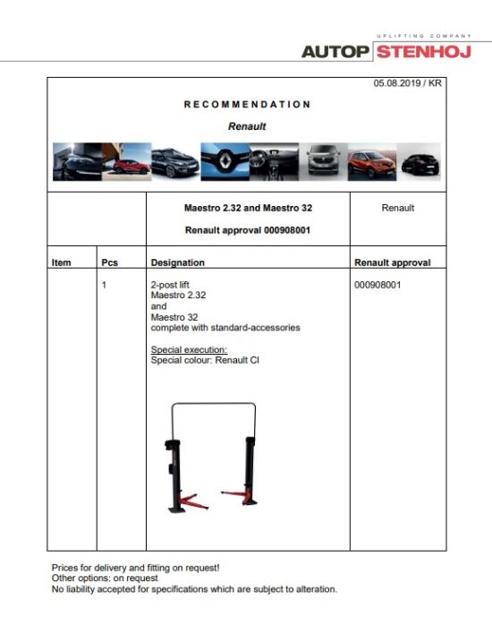 Dvigalo ima odobritev priznanih proizvajalcev vozil kot je npr. skupina BMW / Mini ter Renault.