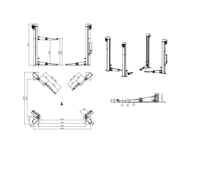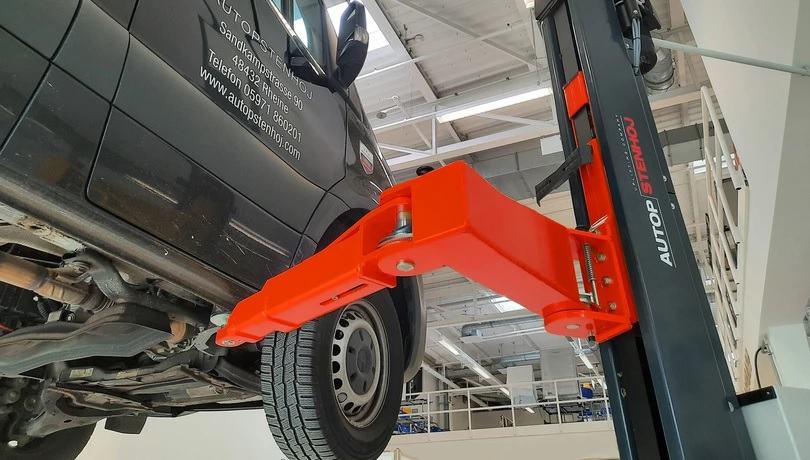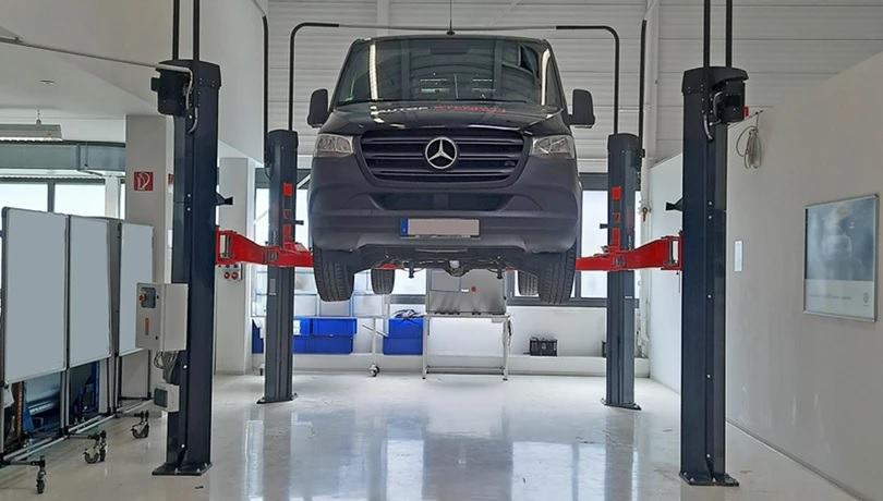 2 × 2 stebra dvigala - elektro mehansko dvigalo z zgibnimi rokami za montažo - sestavljanje ali servisiranje avtodomov, montažo dodatne opreme na lahka gospodarska vozila, terenska vozila ali kmetijske stroje.