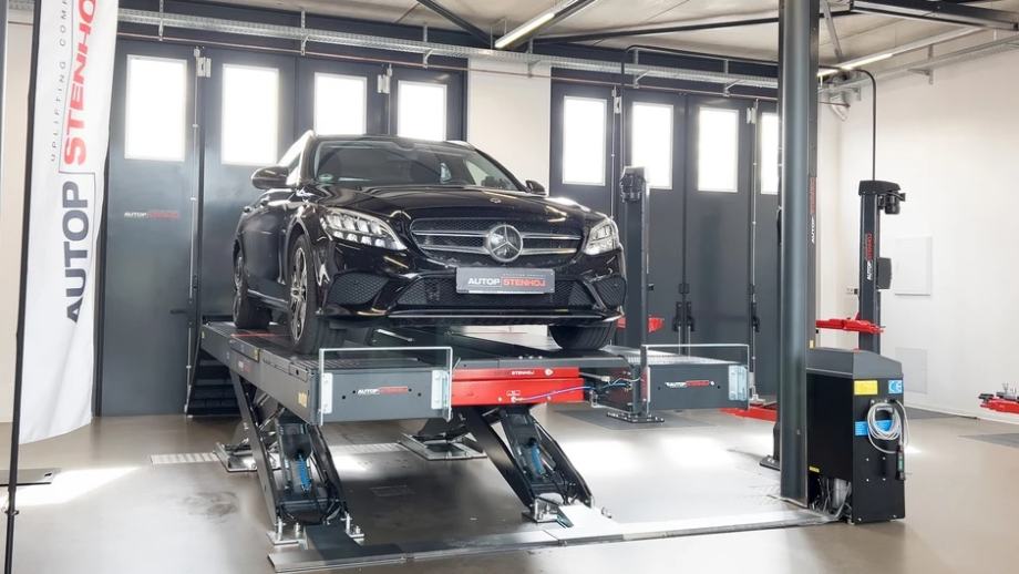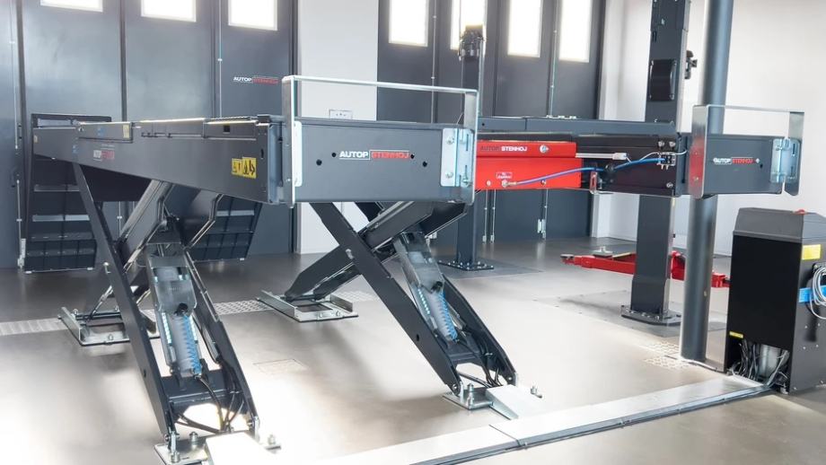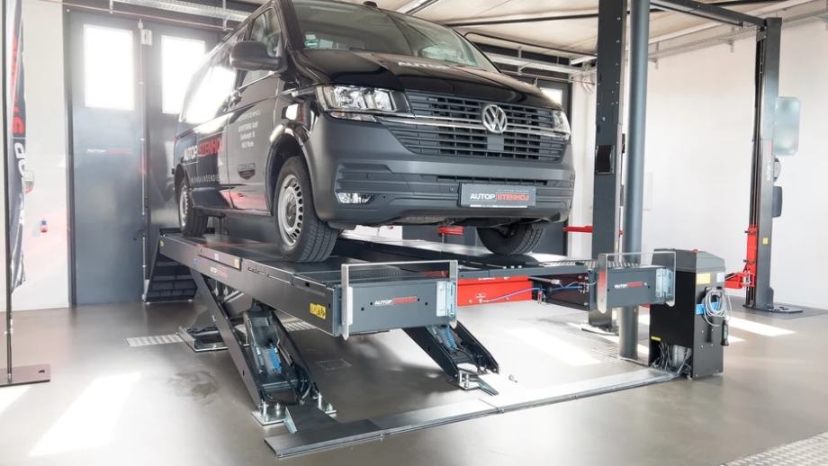 Dvigalo Autopstenhoj MagiX 43-46 z vmesnim škarjastim dvigalom, poglobitvami za vrtljive plošče in zadaj drsnimi pomičnimi ploščami.