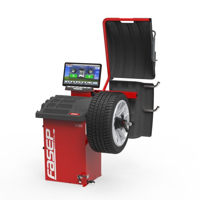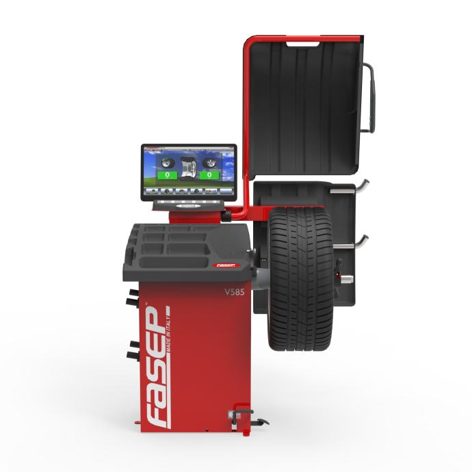 FASEP Videotronic V585.2 Premium vulkanizerska centrirka z 19” ekranom, pnevmatskim vpenjanjem kolesa, točkovnim laserjem za pomoč pri točni namestivi uteži in EMS merilnim sistemom za hitrejše odčitavanje dimenzij kolesa.