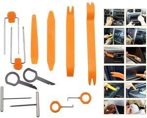 Set orodij je zasnovan tako, da preprečuje poškodbe pri demontaži različnih delov v notranjosti kot zunanjosti avtomobila. V kompletu dobite tudi orodje za demontažo avtoradia. Zelo dobro se obnese pri odstranjevanju notranjih ter zunanjih oblog, širokih/ozkih robov in letvic in ročajev. Uporablja se ga lahko tudi pri lesenih delih (mehek ali trd les), obnovitvi starin, oblazinjenju ter usnjenih predelih.