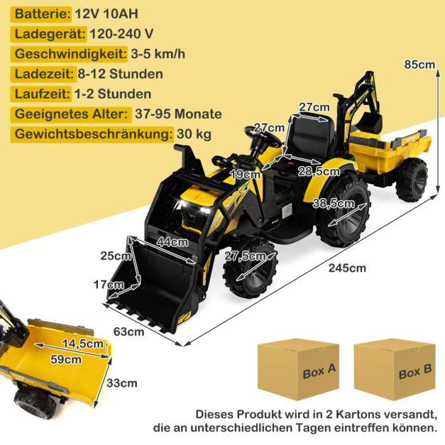 Pristna vozniška izkušnja: vozni otroški bager je odposlan v 2 škatlah, kar pomeni, da lahko prispejo ob različnih urah. S pristnim traktorjem, prikolico, žlico za izkopavanje in bagersko lopato se lahko otroci pretvarjajo, da so kmet ali gradbeni delavec. Žarometi in nastavljiva hitrost ponujajo tudi realistično vožnjo.