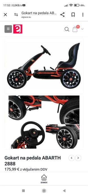 Prodam zabaven gokart, kupljen nov, z nastavljivim sedežem z naslonjalom, za starost 3-8 let, mehkimi gumami. Precej dobro ohranjen, skozi dal enega otroka. Zraven priložim nov komplet pedal z zobnikom v vrednosti 32€. Nisem premontiral, ker je medtem otrok ze prerastel zadevo (čez zimo)