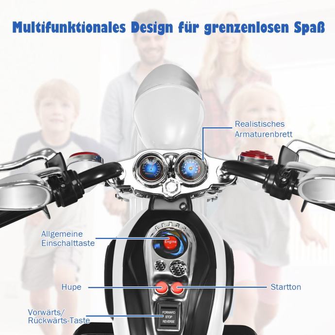 Gibanje naprej in nazaj: za otroke je zelo enostavno uporabljati. Vse kar morate storiti je, da pritisnete gumb za zagon, izberete način naprej ali nazaj in uporabite pedale. Motocikel je mogoče hitro in enostavno napolniti.