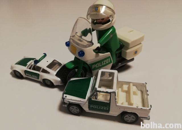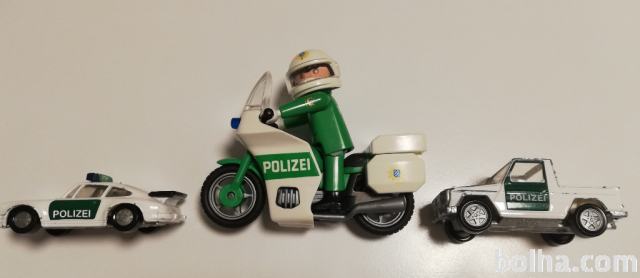 Prodam 2 kovinska avtomobila in Playmobilov motor z motoristom. Avtomobila sta dolžine 8cm. Eden je višine 2,5cm, drugi pa 3,5cm.