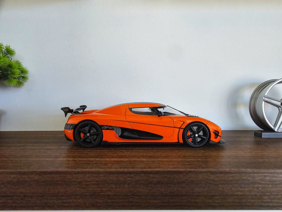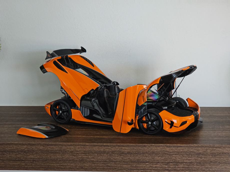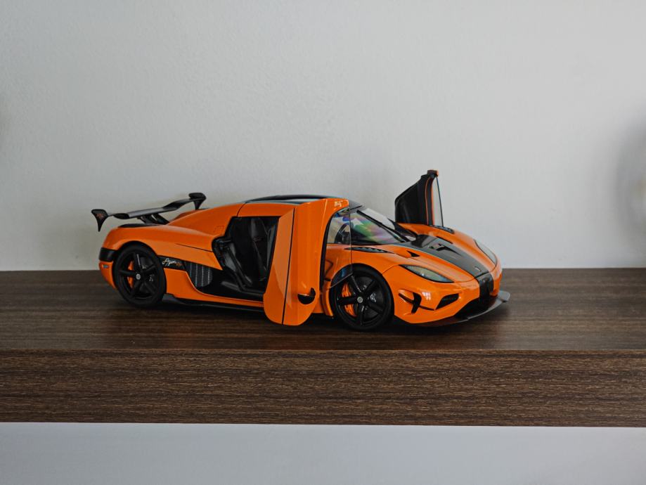 Prodam odlično ohranjen modelček Koenigsegg Agera RS Cone Orange / Carbon with Black Accents, proizvajalca Autoart v merilu 1:18. Modelček je kratek čas preživel v skrbno zaprti vitrini. Iz škatle in nazaj v škatlo se je dajal z rokavicami.