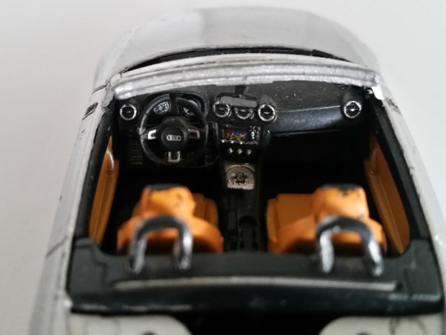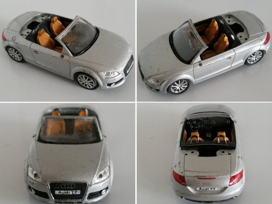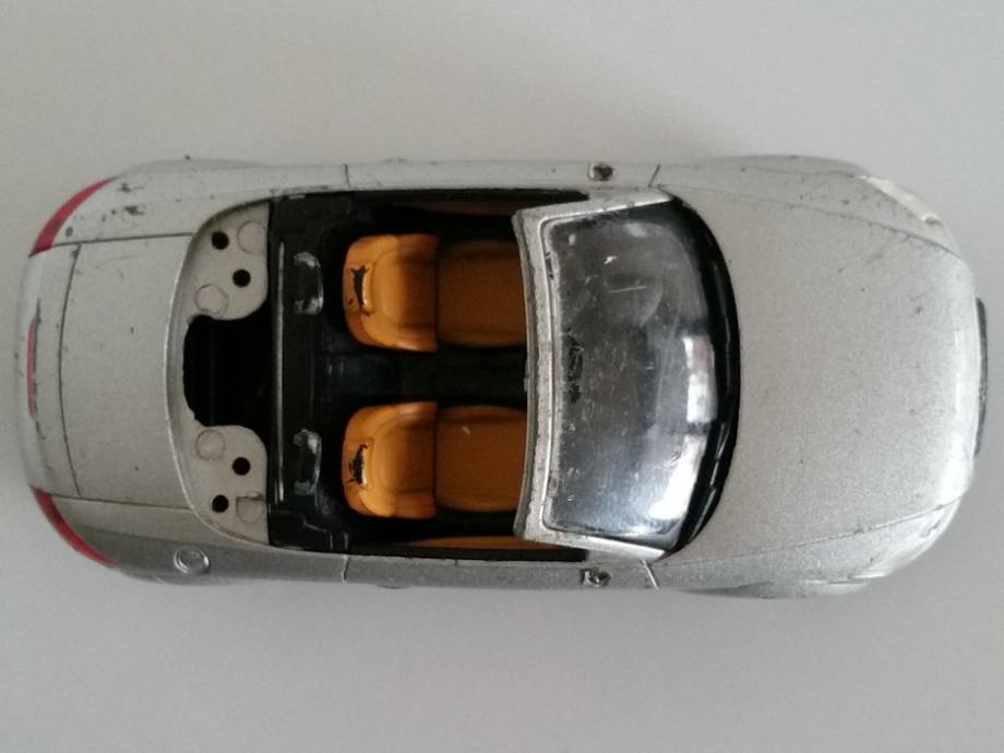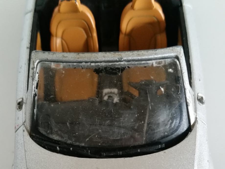 zadaj manjka zložljiva streha, manjkata obe bočni ogledali, manjka prestavna ročica, volan je dvakrat zlomljen - sicer kompleten, kolesa so brezhibna.