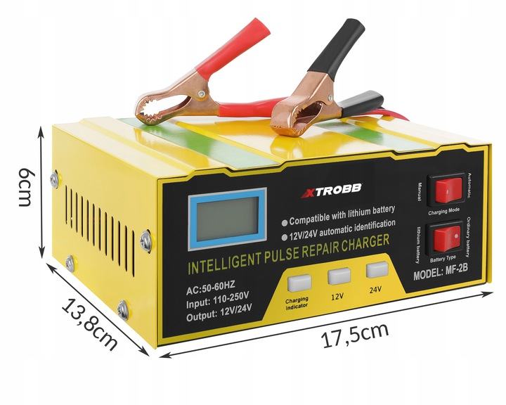 SPECIFIKACIJA – barva: rumeno-črna; material: kovina; vhodna napetost: 110-250V; izhodna napetost: 12 / 24V; frekvenca: 50-60 Hz; moč: 180W; delovni tok: 12V: 0-10A / 24V: 0-7A; delovna temperatura: -20 ° C do + 50 °; zaslon: LED; zaščitna funkcija: šestkratna varnostna zaščita; funkcija popravljanja impulza: da; mere (dolžina / širina / višina): 17,5 / 13,8 / 6cm; teža: 0,8 kg