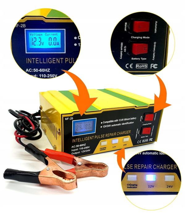 VISOKO KOMPATIBILEN – usmernik je krmiljen z mikroprocesorjem, ki samodejno prilagaja polnilni tok napetosti. Ima funkcijo samodejnega zaznavanja napetosti baterije (12 V ali 24 V) . Popolnoma deluje z litijevimi, kalcijevimi, AGM in mokrimi baterijami, kar pomeni, da se lahko uporablja v avtomobilih, motornih kolesih, kosilnicah, čolnih in drugih vozilih .