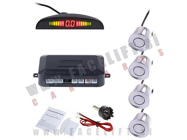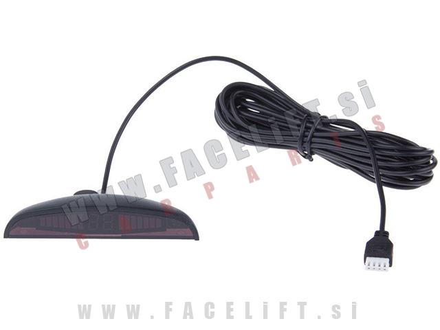Parkirni senzorji z LED prikazovalnikom. V kompletu prejmete štiri parkirne senzorje, kontrolno enoto, LED prikazovalnik, sveder za vrtanje ustrezne luknje in vse potrebno za priklop. Senzorji so novi, z garancijo.