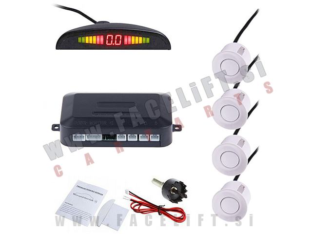 Parkirni senzorji z LED prikazovalnikom. V kompletu prejmete štiri parkirne senzorje, kontrolno enoto, LED prikazovalnik, sveder za vrtanje ustrezne luknje in vse potrebno za priklop. Senzorji so novi, z garancijo.