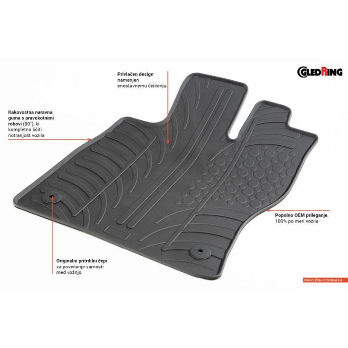 Gumijasti predpražniki Gledring so izdelani po meri vašega modela vozila in se mu v celoti prilegajo. Opremljeni so s pritrditvenimi čepi, ki preprečujejo drsenje predpražnika in s tem povečujejo varnost. Njihova zasnova z višjim robom zadržuje umazanijo znotraj predpražnika, za enostavnejše čiščenje.