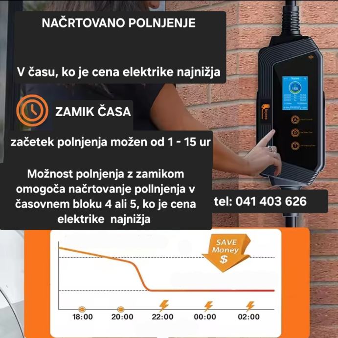 Možen zamik polnjenja od 1 do kar 15ur za polnjenje v nočnem času, ko je elektrika cenejša.