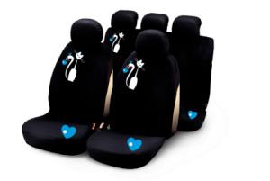 Sedežne prevleke MY SWEET CAT WHITE. Komplet vključuje prevleke prednjih in zadnjih sedežev in pokrivala za vse vzglavnike. S tremi zadrgami in plastičnimi kaveljčki za enostavno namestitev.
