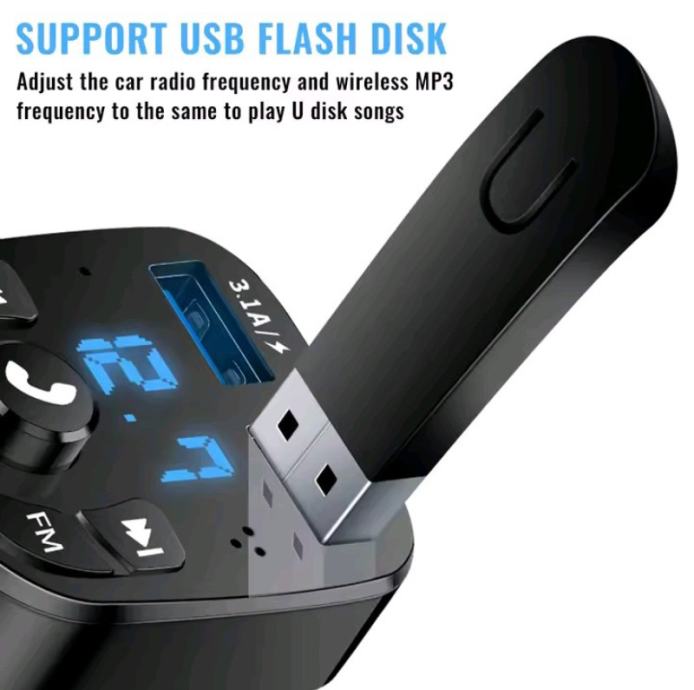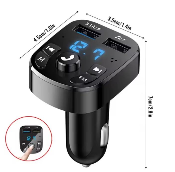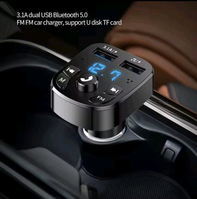 Avto brezžični Bluetooth adapter, hitri polnilec 3.1A, LED prikazovalnik napetosti v voltih, FM oddajnik. Prostoročno telefoniranje z vgrajenim mikrofonom, oddajnik FM za povezavo z vašim avtoradijem, in MP3 multimedija preko USB