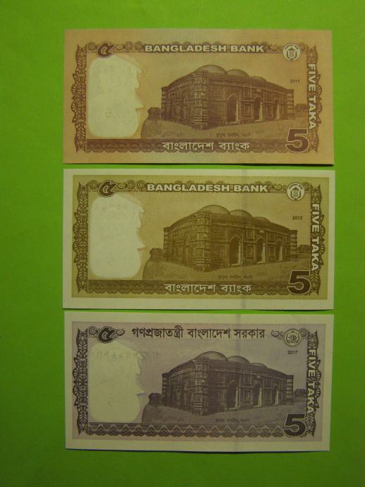 Prodam tri bankovec iz Bangladeša za 5 Taka ( 3 x 5 BDT), kot jih lahko vidite na fotografijah in so povsem novi - UNC kvalitete. Slednji so letnic 2011, 2015 in 2017.