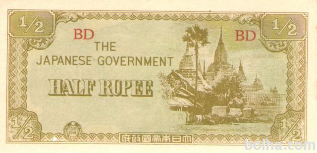 Prodam bankovec 1/2 RUPES P113b-1942 CENA € 7,90,,5 RUPES P15b-1942 CENA € 7,90 IN 10 RUPES P16a-1943 CENA € 5,90 (JAPONSKA OKUPACIJA BURME) aUNC Kvaliteta.