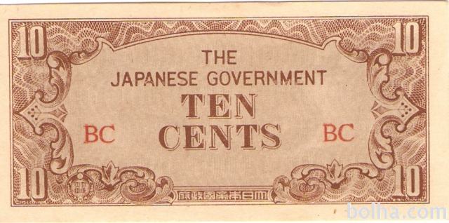 Prodam bankovec 10 CENTS P11a (JAPONSKA OKUPACIJA BURME), 1942. aUNC/UNC Kvaliteta.