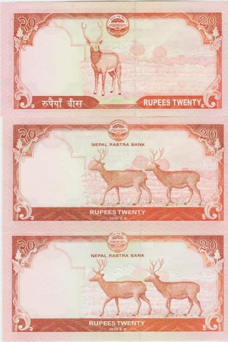 Prodam BANKOVEC 20 RUPEES P62a.2- 2010 ,, 20 RUPEES P78a- 2016 IN 20 RUPEES P78b- 2020-SPODNJI (NEPAL)UNC kvalitete.CENA JE ZA 1 BANKOVEC.