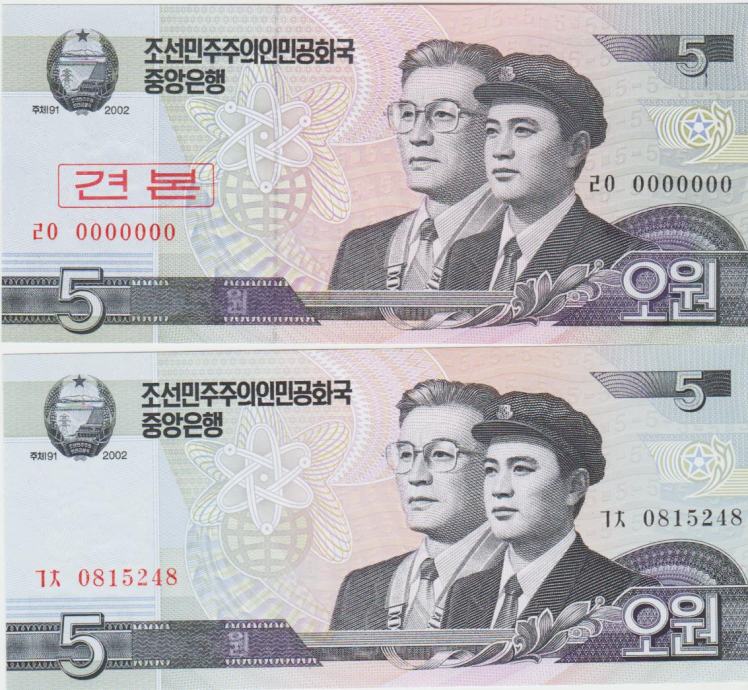 Prodam bankovec 5 WON P58s-"SPECIMEN", IN 5 WON P58a (SEVERNA KOREJA) 2002.UNC kvalitete..CENA JE ZA 1 BANKOVEC