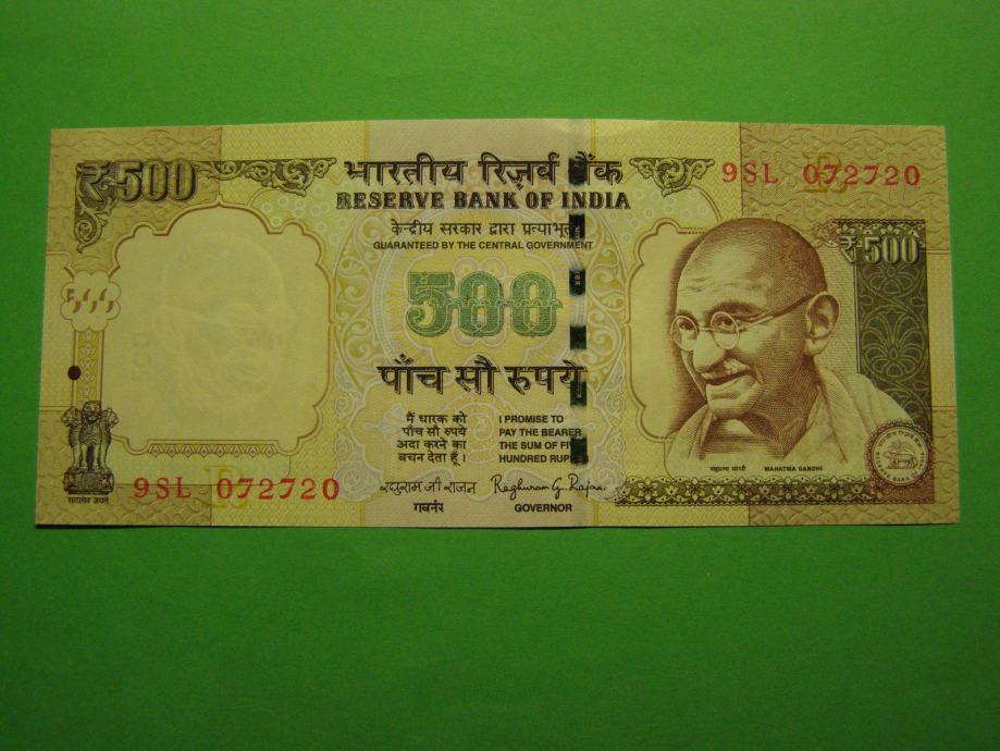 Prodam bankovec za 500 Rupij iz Indije (500 INR), kot ga vidite na fotografijah in je nov - UNC kvalitete. Bankovec je brez oznak za slepe in slabovidne.
