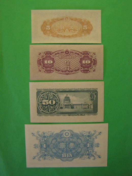 Prodam set bankovcev za 5, 10 in 50 Sen ter za 1 Yen iz Japonske, kot jih lahko vidite na fotografijah in so povsem novi - UNC kvalitete.