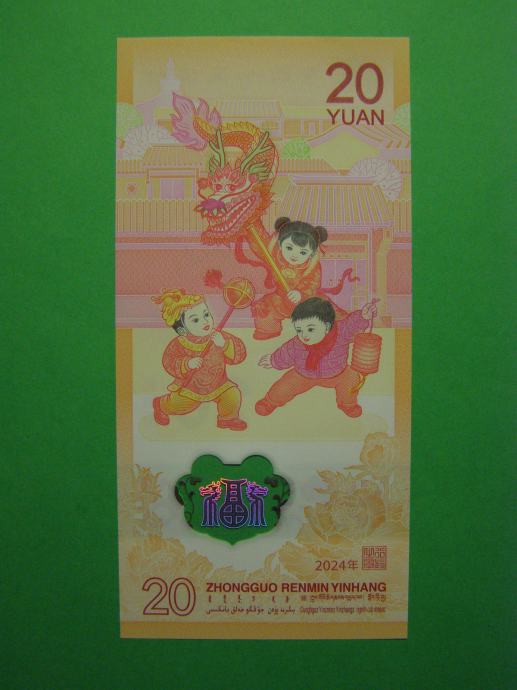 Prodam POLIMERNI PRILOŽNOSTNI bankovca za 20 Yuanov ( 20 CNY) iz Kitajske, izdana ob priložnosti "Leto zmaja", kot ga lahko vidite na fotografijah. Bankovca je povsem nov - UNC kvalitete.