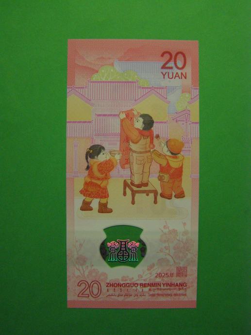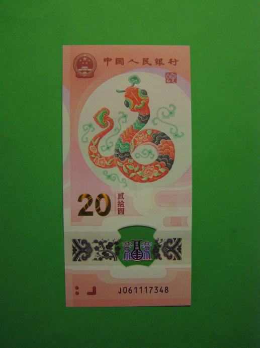 Prodam POLIMERNI PRILOŽNOSTNI bankovca za 20 Yuanov ( 20 CNY) iz Kitajske, izdana ob priložnosti "Leto kače", kot ga lahko vidite na fotografijah. Bankovca je povsem nov - UNC kvalitete.