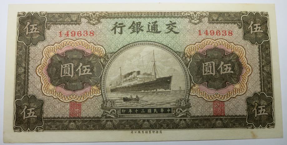 Odlično ohranjena bankovca za 5 in 10 Juanov iz Kitajske - Bank of Communications letnik 1941. UNC kvaliteta.
