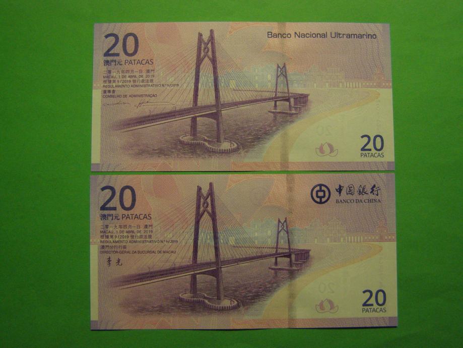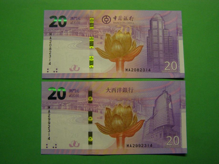Prodam PRILOŽNOSTNA bankovca za 2 x 20 Patacas iz Macaa (2 x 20 MOP), kot ju lahko vidite na fotografijah in sta povsem nova - UNC kvalitete. Bankovca sta izdaji Banco Da China in Banco Nacional Ultramarino.