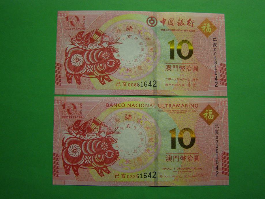 Prodam dva bankovca za 10 Patacas iz Macaa (2 x 10 MOP), kot ju lahko vidite na fotografijah in sta povsem nova - UNC kvalitete. Leto pujsa (Banco Da China in Banco Nacional Ultramarino). Lunar : Leto pujsa