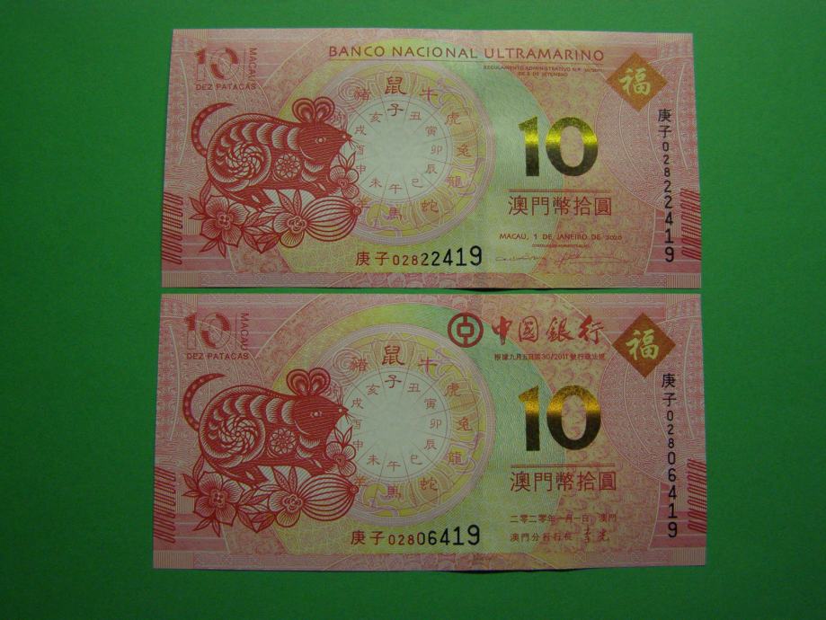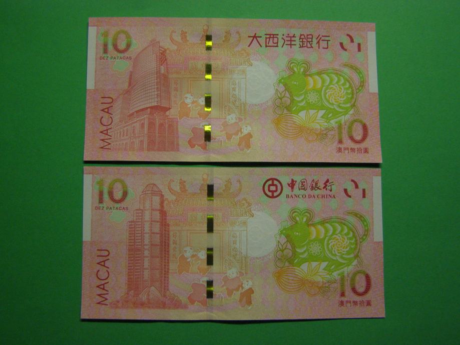 Prodam dva bankovca za 10 Patacas iz Macaa (2 x 10 MOP), kot ju vidite na fotografijah in sta nova - UNC kvalitete. Leto podgane-miši (Banco Da China in Banco Nacional Ultramarino). Lunar : Leto podgane