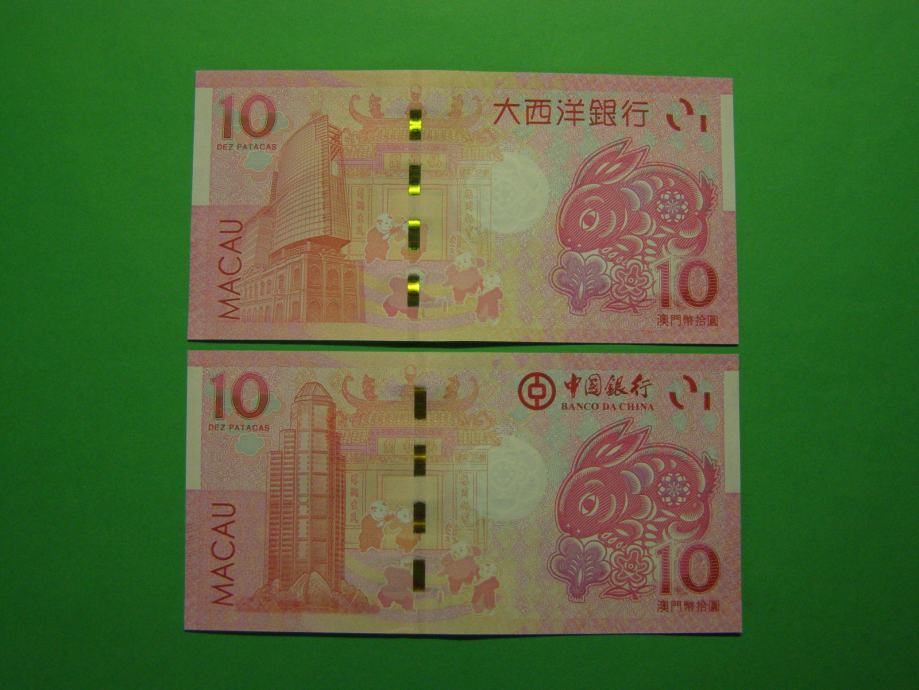 Prodam dva bankovca za 10 Patacas iz Macaa (2 x 10 MOP), kot ju vidite na fotografijah in sta nova - UNC kvalitete. Leto zajca (Banco Da China in Banco Nacional Ultramarino). Lunar : Leto zajca